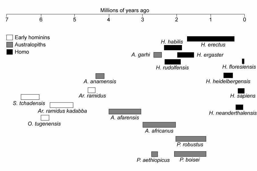 The clock starts at 6.5 Ma with the cranium from Chad (Sahelanthropus tchadensis). Time ticks by on the screen at the chosen rate until 6 Ma when symbols representing the next known specimens (belonging to the species called Orrorin tugenensis) flash into view. Then specimens belonging to Ardipithecus pop on the screen, and so on until the proliferation of anatomically modern humans in the Late Pleistocene. This movie offers a different perspective on the hominin fossil record from that of conventional evolutionary tree drawings, where the time span of a species is sometimes estimated based on a single specimen or very few specimens. See this diagram below for just one of the myriad examples (Dunsworth, 2007).