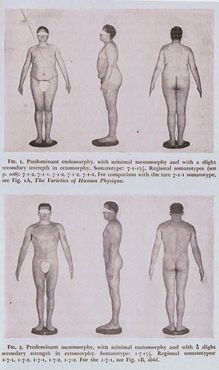 One might expect this sort of work to have been done by anthropologists, but Sheldon was a psychologist. The idea was not just to study body shape, but that shape is a window to the inner soul--Sheldon called this new science 'Constitutional psychology'. Of course, you know the stereotypes: the jovial Santa-like fat person, edgy skinny one, and manly Heroic (that is, sexily muscled) mesomorph. Sheldon considered (i.e., studied) women, too, but since women aren't very important he mostly cared about men (that is, professionally speaking).