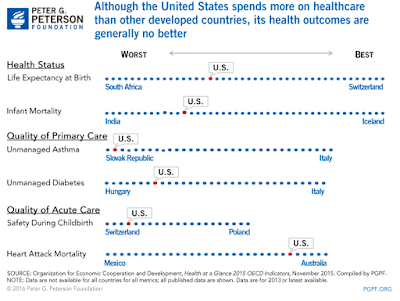 In any case, whatever system we adopt, we've still got problems. Although the rising cost of medical care in the United States has slowed some with the ACA, at almost 18% of GDP health care spending here is the most expensive in the world, far exceeding that of any other high-income country, most of which have national health care (e.g., source). In part it's because of the high cost of medical care, the higher use of expensive technology (e.g., MRI's, mammograms and C sections) and the exorbitant cost of pharmaceuticals. And this is even with limitations imposed by insurance companies to control costs. In addition, the cost of individual premiums has soared for people who aren't eligible for government subsidies to help cover the cost of insurance, in part, because fewer healthy people have purchased insurance than companies anticipated. And deductibles and co-pays have risen sharply. Insurance companies still have to turn a profit to stay in the health insurance marketplace.