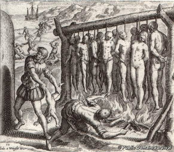 | Depiction of Spanish atrocities committed in the conquest of Cuba in Bartolomé de Las Casas's "Brevisima relación de la destrucción de las Indias", 1552. The rendering was by the Flemish Protestantartist Theodor de Bry. Public Domain. |